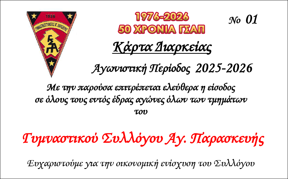 Σας ενημερώνουμε ότι είναι στη διάθεση των φίλων του συλλόγου η νέα επετειακή κάρτα διαρκείας 2025-2026.Το 2026 ο σύλλογος μας συμπλήρώνει 50 χρόνια συνεχούς παρουσίας στον αθλητισμό της Αγίας Παρασκευής και στο γυναικείο μπάσκετ.Μπορείτε να την προμηθευτείτε στον προσεχή εντός έδρας αγώνα των γυναικών την Κυριακή 19 Οκτωβρίου στις 17:00 στην προνομιακή τιμή των 20€.